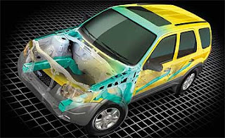 LIKE most recreational four-wheel drives, Escape is built on a (one-piece) monocoque chassis for passenger car-like stiffness, torsional rigidity and crash performance. Energy-absorbing measures honed in on the steering column, front fender and the knee bolsters located below the instrument panel. Dual front airbags are standard across the range. The front seatbelts have pretensioners, belt "grabbers" and anti-submarining ramps. They also adjust for height. Height adjustable (two-notch) headrests and three-point seatbelts are provided for outboard occupants; the centre rear has an inferior lap belt and goes without a head restraint. Four-channel anti-lock brakes system (ABS) with electronic brake-force distribution (EBD) is standard on XLT, unavailable on XLS.